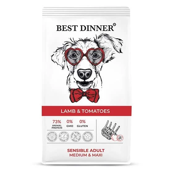 Полнорационный сухой корм для собак средних и крупных пород склонных к аллергии и проблемам с пищеварением с ягненком и томатами