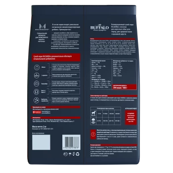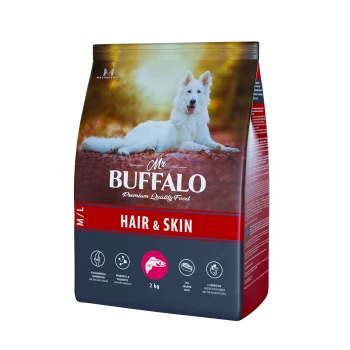 Полнорационный сухой корм Mr. Buffalo HAIR & SKIN с лососем для взрослых собак всех пород, для здоровой кожи и красивой шерсти. Рацион, разработанный специально для кормления взрослых собак с повышенной чувствительностью кожи, склонных к частым кожным аллергическим реакциям, а также для собак, которым необходима смена вкусовых качеств их повседневного рациона. Мясо лосося содержит большое количество Омега-3 и Омега-6 жирных кислот. Эти кислоты питают и укрепляют волосяную луковицу, улучшают состояние шерсти, придают ей здоровой блеск и шелковистость.