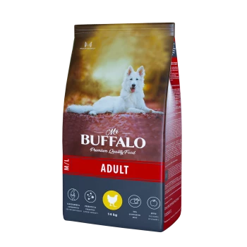 Полнорационный сухой корм Mr. Buffalo с курицей для взрослых собак всех пород. Оптимальное содержание белков, жиров и углеводов делает этот корм подходящим для собак средних и крупных пород. Именно на их потребности рассчитан и витаминно-минеральный премикс. Сбалансированный состав обеспечивает прекрасную форму взрослых животных, препятствуя набору лишнего веса и предотвращая заболевания суставов.