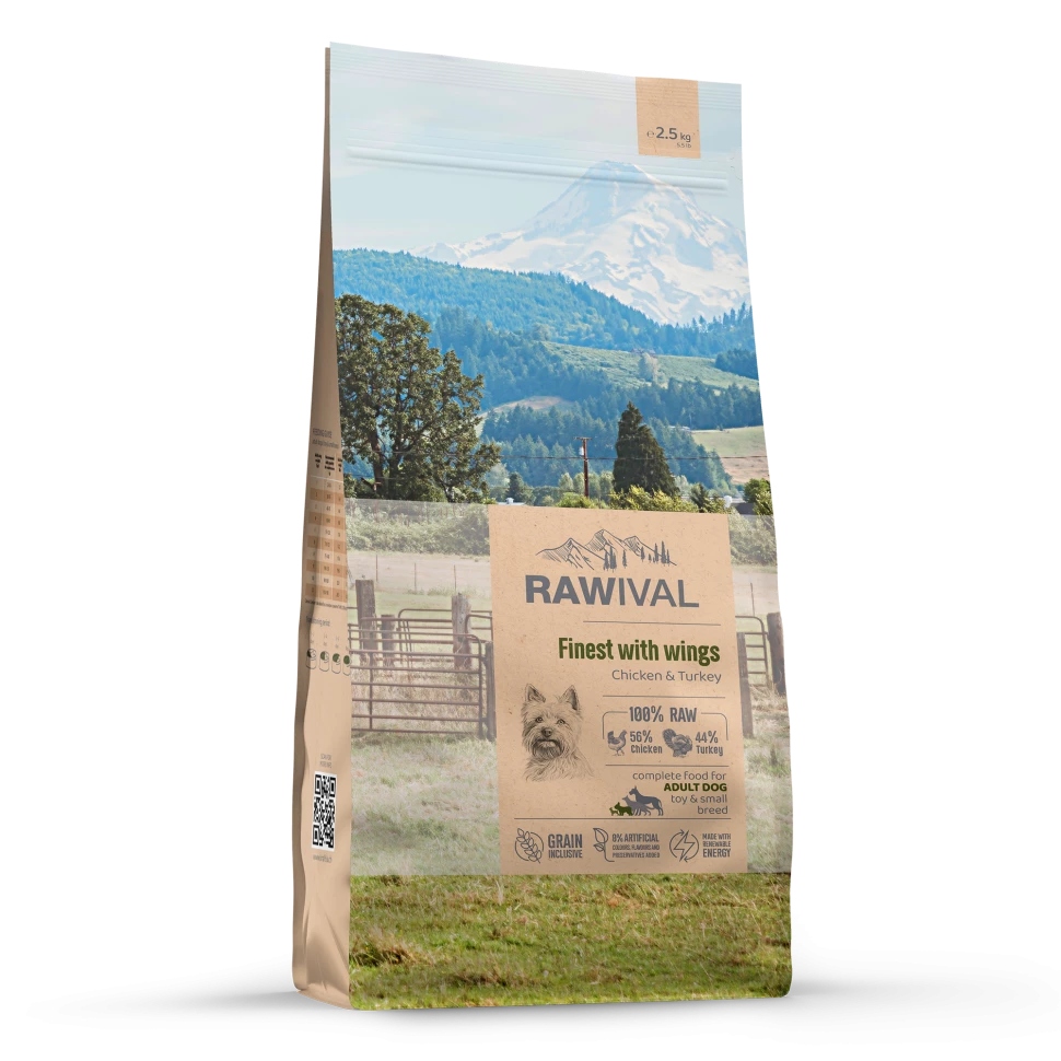 Курица и индейка. Полнорационный корм для взрослых собак карликовых и маленьких пород. Ингредиенты: сырая бескостная курица (20%), сырая бескостная индейка (16%), дегидратированный белок курицы (12%), дегидратированный белок индейки (11%), куриный жир, гидролизованный белок птицы (курица, индейка), гидролизованный белок рыбы (треска, пикша), рыбий жир (из лосося), спельта, коричневый рис, ячмень, овёс, просо, куриные потроха (печень, сердце, почки), сушёные цельные яйца, льняное семя, сушёная свекольная пульпа, мука из люцерны, гороховая клетчатка, инулин цикория (0,4%), экстракт дрожжей (источник маннанолигосахаридов) (0,3%), фруктоолигосахариды (0,3%), сушёный аскофиллум узловатый, карбонат кальция, монокальцийфосфат, хлорид калия, хлорид натрия, сушёные пивные дрожжи, глюкозамин, хондроитина сульфат, сушёная клюква, сушёная ацерола, сушёная черника, сушёная спаржа, сушёный розмарин, сушёная куркума, сушёная календула, семена и шелуха семян подорожника, экстракт юкки Шидигера. В связи с особенностями производства готовый продукт может содержать в следовых количествах растительные и животные белки (курица, индейка, говядина, баранина, кролик, утка, свинина, рыба, коза, гусь), которые используются заводом в других рецептурах.