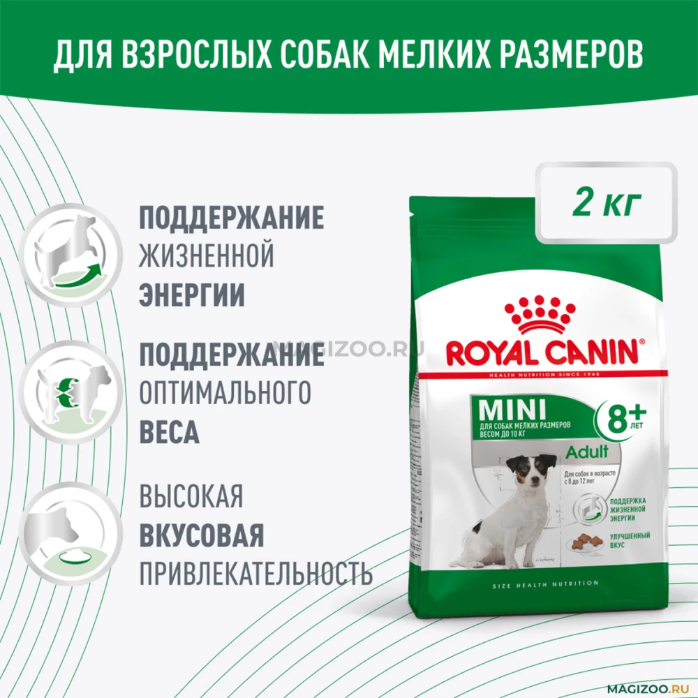 Корм сухой полнорационный для взрослых собак мелких размеров (весом до 10 кг) старше 8 лет Royal Canin Mini Adult 8+разработан с учетом потребностей в питательных веществах Вашего питомца в начале периода возрастных изменений. Ключевые особенности: Поддержание жизненной энергии. Поддержание оптимального веса. Высокая вкусовая привлекательность. Оптимальное содержание питательных веществ способствует поддержанию здоровья у собак мелких размеров и помогает бороться с первыми признаками старения. Формула содержит комплекс антиоксидантов, включающий витамины А, С, Е , лютеин, таурин, а также полифенолы зеленого чая, способствующий поддержанию жизненных сил стареющих собак Некоторым собакам мелких пород свойственна привередливость в питании. Благодаря исключительно привлекательному аромату ROYAL CANIN® Mini Adult 8+ обладает чрезвычайно высокой вкусовой привлекательностью и способен удовлетворить даже самый взыскательный вкус. При этом, обладая высокой вкусовой привлекательностью, продукт отличает умеренная калорийность для поддержания оптимального веса животного. Для собак мелких пород характерна высокая потребность в энергии, поэтому важно оптимальное количество калорий. Состав: злаки, изолят растительных белков*, дегидратированные белки животного происхождения, животные жиры, гидролизат белков животного происхождения (вкусоароматические добавки), растительная клетчатка, витамины и минеральные вещества, соевое масло, дрожжи, аминокислоты (в том числе таурин, L-карнитин)