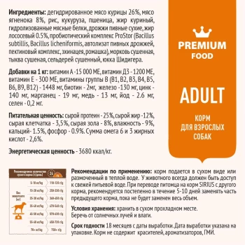 Дегидрированное мясо курицы 26%, мясо ягненока 8%, рис, кукуруза, пшеница, жир куриный, гидролизованные мясные белки, дрожжи пивные сухие, жир лососевый 0.5%, пробиотический комплекс ProStor (Bacillus subtillis, Bacillus licheniformis, автолизат пивных дрожжей, пектиновый комплекс, эхинацея, ромашка), морковь сушенная, тыква сушеная, сельдерей сушенный, юкка Шидигера. Витамин А -15 000 МЕ, витамин Д3 - 1200 МЕ, витамин Е - 300 МЕ, витамины группы В (В1, В2, В3, В4, В5, В6, В9, В12) - 1448 мг, биотин - 2мг, железо -130 мг, цинк - 140 мг, марганец - 19 мг, медь - 13 мг, йод - 2.6 мг, селен - 0,2 мг. Сырой протеин - 25%, сырой жир -12%, сырая клетчатка - 3,5%, сырая зола - 8%, влажность - 9%, кальций- 1.5%, фосфор - 0.9%. Сумма омега 6 и 3 жирных кислот - 2,6%.