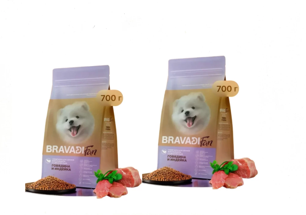 Сухой корм BRAVADI FAN щенкам всех размеров - это ежедневный рацион, который предназначен для кормления щенков с 2 до 12 месяцев, а также беременных и актирующих собак. Разработан и произведен на собственном производстве с учетом необходимых потребностей в питании собак: отличные вкусовые качества, сбалансированное соотношение белков, жиров, витаминов и минералов для оптимального развития и поддержания питомца на всех этапах жизни. У Высокое содержание мясных ингредиентов; • Пребиотики, содержащиеся в корме, улучшают рост и размножение полезной микрофлоры кишечника, нормализуют пищеварение, сохраняя баланс в кишечнике, и укрепляют иммунитет. • Корм обогащен комплексом витаминов и минералов для поддержания правильного обмена веществ в организме. • С добавлением масла лосося, семени льна, водорослей Аскофиллум и пивных дрожжей для здоровой кожи и шерсти, улучшения обмена веществ и укрепления иммунной системы. СОСТАВ: Мясные ингредиенты (дегидрированная говядина 22%, дегидрированная индейка 14%), ячмень, рис, жир индейки, маис, пульпа свеклы, дрожжи сухие пивные, масло лосося, семя льняное, витаминно-минеральная добавка, сульфат кальция, Аскофиллум, пребиотики МОС, экстракт Юкки, глюкозамин 100 мг/кг, хондроитин, 100 мг/кг, антиоксидант. ПИЩЕВАЯ ЦЕННОСТЬ: влажность - 8%, протеин - 25%, жир - 16%, зола - 5,9%, клетчатка - 2,9%, кальций - 1,5%, фосфор - 0,7%. Витамин А - 22500 МЕ/кг; Витамин ДЗ - 1850 МЕ/кг, Витамин Е - 180 мг/кг. Калорийность: 388 ккал/100 г. ВИТАМИННО-МИНЕРАЛЬНАЯ ДОБАВКА: Витамин А, Витамин ДЗ, Витамин Е, Витамин В1, Витамин В2,Витамин ВЗ, Витамин В4, Витамин В5, Витамин В6, Витамин В12, Витамин Вс, Витамин Н, Марганец, Цинк, Медь, Железо, Иод. Селен.