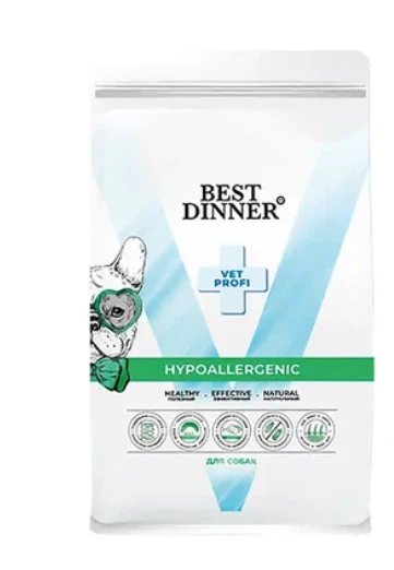 Полнорационный диетический сухой корм для взрослых собак всех пород при пищевой аллергии и непереносимости. Применяется в случаях появления симптомов пищевой аллергии и непереносимости. При использовании данного корма необходимо исключить из рациона собаки все прочие источники белков до полного исчезновения признаков аллергии или непереносимости. Рекомендуемая продолжительность применения от трех до восьми недель. Если признаки непереносимости или аллергии исчезают корм допустимо применять на постоянной основе. Рекомендуется проконсультироваться с ветеринарным врачом об употреблении или о продлении периода использования данного корма. состав: Рис, дегидрированная свинина, дегидрированная чёрная львинка, жир индейки, свекольная пульпа, рыбий жир, витамины и минералы, дрожжи пивные и продукты их переработки, семена льна, топинамбур, Юкка Шидигера, антиоксидант (смесь токоферолов). Аналитический состав: сырой протеин 21%, сырой жир 12%, сырая зола 6.5%, сырая клетчатка 3%, углеводы 49,5%, омега-3 жирные кислоты 0,32%, омега-6 жирные кислоты 2,7%, влага 8%. Витамины, на 1 кг: А 20 000 МЕ, D3 1800 МЕ, Е 300 мг, витамины группы В 2100 мг, С 50 мг, пантотеновая кислота 20 мг, ниацин 22 мг. Минералы в 1 кг: Са 1%, Р 0,9%, цинк 150 мг, медь 12 мг, железо 50 мг, йод 4 мг, селен 0,2 мг, натрий 0,3%, калий 0,6%, марганец 20 мг. Антиоксиданты и консерванты: смесь токоферолов. Энергетическая ценность: 3656 ккал/кг