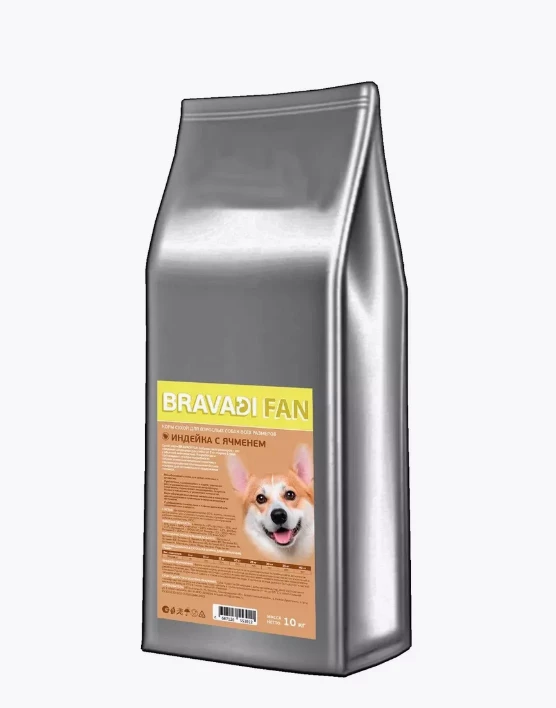Сухой корм BRAVADI FAN собакам всех размеров - это ежедневный рацион для собак от 5 кг старше 1 года с обычной активностью. Разработан и произведен с учетом потребности собаки: отличные вкусовые качества и сбалансированное соотношение белков и жиров для оптимального поддержания питомца. • Монобелковый состав для собак склонных к аллергии; • Пребиотики, содержащиеся в корме, улучшают рост и размножение полезной микрофлоры кишечника, нормализуют пищеварение, сохраняя баланс в кишечнике, и укрепляют иммунитет. • Корм обогащен комплексом витаминов и минералов для поддержания правильного обмена веществ в организме. / С добавлением семени льна и пивных дрожжей для здоровой кожи и шерсти. СОСТАВ: Дегидрированная индейка 25%, ячмень, пшеница, жир индейки, рис, сушеная пульпа свеклы, сульфат кальция, дрожжи пивные, семя льняное, витаминно-минеральная добавка, пребиотики МОС. ПИЩЕВАЯ ЦЕННОСТЬ: влажность - 8%, протеин - 25%, жир - 13%, зола - 6,8%, клетчатка - 2,8%, кальций - 1,3%, фосфор - 0,8%. Витамин А - 18000 МЕ/кг, Витамин ДЗ - 1200 МЕ/кг, Витамин Е - 150 мг/кг. Калорийность: 372 ккал/100 г. ВИТАМИННО-МИНЕРАЛЬНАЯ ДОБАВКА: Витамин А, Витамин ДЗ, Витамин Е, Витамин B1, Витамин B2, Витамин ВЗ Витамин В4, Витамин В5, Витамин В6, Витамин В12, Витамин Вс, Витамин Н, Марганец, Цинк, Медь, Железо, Иод, Селен.