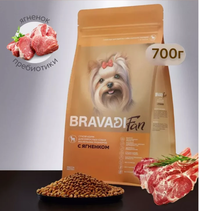 Сухой корм BRAVADI FAN собакам маленьких размеров - это ежедневный рацион для собак весом до 10 кг и старше 10 месяцев. Разработан и произведен на собственном производстве с учетом необходимых потребностей в питании собак: отличные вкусовые качества, сбалансированное соотношение белков, жиров, витаминов и минералов для оптимального развития и поддержания питомца на всех этапах жизни. • Высокое содержание мясных ингредиентов; • Пребиотики, содержащиеся в корме, улучшают рост и размножение полезной микрофлоры кишечника, нормализуют пищеварение, сохраняя баланс в кишечнике, и укрепляют иммунитет. • Корм обогащен комплексом витаминов и минералов для поддержания правильного обмена веществ в организме. • С добавлением масла лосося, семени льна, водорослей Аскофиллум и пивных дрожжей для здоровой кожи и шерсти, улучшения обмена веществ и укрепления иммунной системы. • Сбалансированное соотношение кальция и фосфора, комплекс хондропротекторов поддержат здоровье костей и подвижность суставов. СОСТАВ: Мясные ингредиенты (дегидрированная индейка 18%, гидролизат ягненка 8%, дегидрированная свинина 7%), рис, ячмень, жир индейки, пульпа свеклы, дрожжи сухие пивные, масло лосося, семя льняное, витаминно-минеральная добавка, сульфат кальция, Аскофиллум, пребиотики МОС, экстракт Юкки, глюкозамин 100 мг/кг, хондроитин 100 мг/ кг, антиоксидант. ПИЩЕВАЯ ЦЕННОСТЬ: влажность - 8%, протеин - 23,5%, жир - 13%, зола - 5,9%, клетчатка - 2,6%, кальций - 1,2%, фосфор - 0,8%. Витамин А - 15000 МЕ/кг, Витамин ДЗ - 1250 МЕ/кг, Витамин Е - 120 мг/кг. Калорийность: 376 ккал/100 г. ВИТАМИННО-МИНЕРАЛЬНАЯ ДОБАВКА: Витамин А, Витамин ДЗ, Витамин Е, Витамин B1, Витамин В2, Витамин ВЗ, Витамин В4, Витамин В5, Витамин В6, Витамин В12, Витамин Вс, Витамин Н, Марганец, Цинк, Медь, Железо, Йод, Селен.