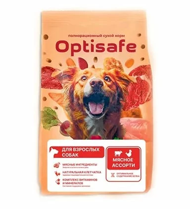 Полнорационный сухой корм OPTISAFE эконом класса для взрослых собак всех пород мясное ассорти весом 13 кг.