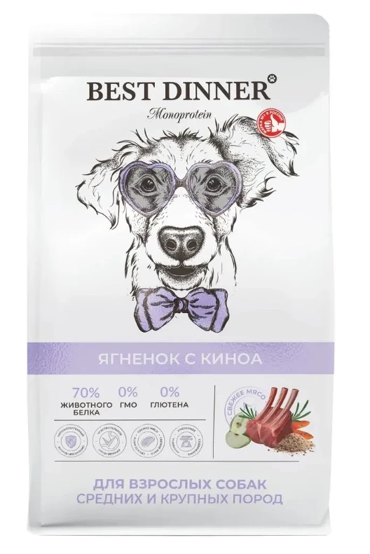 Сухой полнорационный корм Best Dinner MONOPROTEIN для собак средних и крупных пород, ягнёнок и киноа 2кг Best Dinner Монопротеин Ягненок с Киноа специально разработан для собак, страдающих аллергией и проблемами с пищеварением. Ягненок – это гипоаллергенный источник белка, легко усваиваемый, оптимально подходящий для питомцев с чувствительным пещеварением. Он богат необходимыми аминокислотами, поддерживающими здоровье мышц и общее благополучие. Киноа – ценный источник клетчатки, способствующий нормализации пищеварения и здоровой микрофлоре кишечника. Этот компонент обеспечивает организм энергией и улучшает усвоение питательных веществ. Корм обогащен витаминами и минералами, необходимыми для поддержания иммунитета и общего здоровья. Он способствует здоровой коже, блестящей шерсти и активной жизни.
