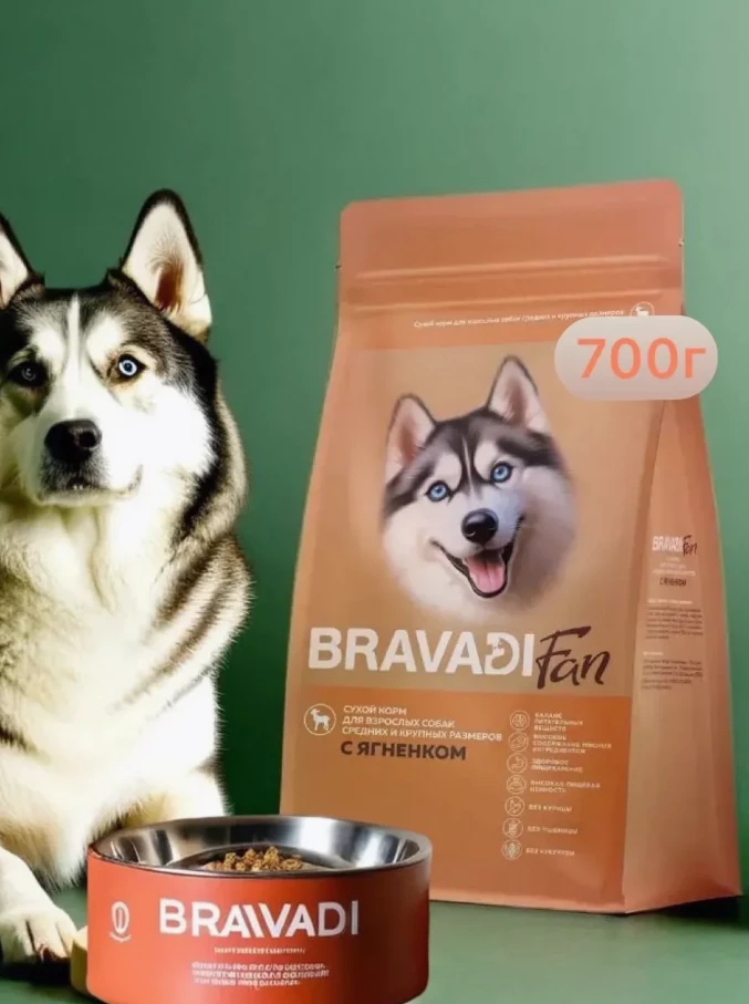 СОСТАВ: Мясные ингредиенты (дегидрированная индейка 18%, гидролизат ягненка 8%, дегидрированная свинина 7%), рис, ячмень, жир индейки, пульпа свеклы, дрожжи сухие пивные, масло лосося, семя льняное, витаминно-минеральная добавка, сульфат кальция, Аскофиллум, пребиотики МОС, экстракт Юкки, глюкозамин 100 мг/кг, хондроитин 100 мг/кг, антиоксидант. ПИЩЕВАЯ ЦЕННОСТЬ: влажность - 8%, протеин - 23,5%, жир - 13%, зола - 5,9%, клетчатка - 2,6%, кальций - 1,2%, фосфор - 0,8%. Витамин А - 15000 МЕ/ кг, Витамин ДЗ - 1250 МЕ/кг, Витамин Е - 120 мг/кг. Калорийность: 376 ккал/100 г. ВИТАМИННО-МИНЕРАЛЬНАЯ ДОБАВКА: Витамин А, Витамин ДЗ, Витамин Е, Витамин В1, Витамин В2, Витамин ВЗ, Витамин В4, Витамин В5, Витамин В6, Витамин В12, Витамин Вс, Витамин Н, Марганец, Цинк, Медь, Железо, Иод, Селен. Сухой корм BRAVADI FAN собакам средних и крупных размеров - это ежедневный рацион для собак весом более 10 кг и старше 1 года. Разработан и произведен на собственном производстве с учетом необходимых потребностей в питании собак: отличные вкусовые качества, сбалансированное соотношение белков, жиров, витаминов и минералов для оптимального развития и поддержания питомца на всех этапах жизни. • Высокое содержание мясных ингредиентов; • Пребиотики, содержащиеся в корме, улучшают рост и размножение полезной микрофлоры кишечника, нормализуют пищеварение, сохраняя баланс в кишечнике, и укрепляют иммунитет. • Корм обогащен комплексом витаминов и минералов для поддержания правильного обмена веществ в организме. • С добавлением масла лосося, семени льна, водорослей Аскофиллум и пивных дрожжей для здоровой кожи и шерсти, улучшения обмена веществ и укрепления иммунной системы. / Сбалансированное соотношение кальция и фосфора, комплекс хондропротекторов поддержат здоровье костей и подвижность суставов.