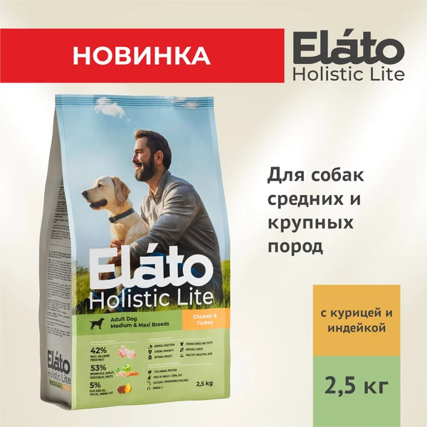 Elato Holistic Lite - корм, разработанный по принципам правильного питания собак. Баланс и полноценные источники белков, жиров и углеводов 42% - Полноценные белки животного происхождения, характерные для холистиков дегидрированное и свежее мясо с низким содержанием жира — полноценный источник белков животного происхождения 53% - Медленные углеводы, полезные ингредиенты ячмень, бурый рис, овощи, фрукты, ягоды — источники клетчатки и полезных углеводов с низким гликемическим индексом. 5% - Баланс жиров рыбий жир, масло семян льна, животный жир обеспечивают баланс ненасыщенных и насыщенных жиров. Специальные ингредиенты для укрепления здоровья Нормальное пищеварение — инулин, экстракт юкки Шидигера Крепкий иммунитет — пивные дрожжи и витамины Оптимальный вес — медленные углеводы Крепкие кости и зубы — кальций, фосфор, витамин D3 Подвижность суставов — глюкозамин и хондроитин Здоровая, красивая шерсть — рыбий жир, семена льна, витамины группы В, биотин Комплекс водо- и жирорастворимых витаминов — А, D3, Е, группы В; микро- и макроэлементов обеспечивает суточную потребность организма собак Обеспечение физиологических потребностей в питании 75% белков животного происхождения Не содержит пшеницы, кукурузы, сои Правильное соотношение кальция и фосфора. Размер гранул: 16 х 6 (± 1,5 мм). Состав: Мясо и мясные ингредиенты 42% (дегидрированное мясо курицы 24%, свежее мясо индейки 15%, гидролизованная печень 3%), ячмень, бурый рис, горох, животный жир, минералы, свекловичный жом, пивные дрожжи, витамины (в т.ч. холина хлорид), морковь, рыбий жир, яблоко, DL-метионин, черника, льняное семя, цикорий, зеленогубый моллюск, юкка Шидигера, глюкозамин, хондроитин, антиоксиданты (в т.ч. натуральные токоферолы). Аналитический состав: Белок 26%; жир 14,5%; клетчатка 3,45%; влажность 8%; зола 7,5%; кальций 1,53%; фосфор 1,10%; Омега-6 3%; Омега-3 0,3%; глюкозамин 35,84 мг/кг; хондроитин сульфат 125,44 мг/кг. Пищевые добавки (на 1 кг): ВитаминA 10000 МЕ; витамин D3 1000 МЕ; витамин Е 50 МЕ; витамин B1 3,00 мг; витамин В2 8,00 мг; витамин B6 2,50 мг; витамин B12 45 мкг; ниацинамид 25 мг; фолиевая кислота 350 мкг; холина хлорид 2200 мг; DL-метионин 6000 мг; цинк 90 мг; марганец 7,00 мг; железо 60 мг; медь 9,00 мг; селен 220 мкг. Энергетическая ценность: 3773 ккал/кг; 15,79 МДж/кг.