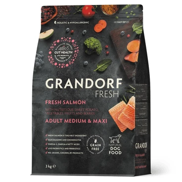 Состав - Свежий бескостный лосось (26%), Дегидрированное мясо индейки (19%), Батат, Горох, Жир индейки (6%), картофель, Порошок корней цикория (натуральный источник пребиотиков: FOS и инулин), Минералы, Льняное семя, Яблоки, Морковь, Пивные дрожжи (природный источник MOS и бета-глюканов), Масло лосося (0,5%), Клюква, Черника, Брокколи, Шпинат, Помидоры, Глюкозамина гидрохлорид (100 мг/кг), Хондроитина сульфат (100 мг/кг), юкка Шидигера, Грейпфрут, Розмарин, Куркума.