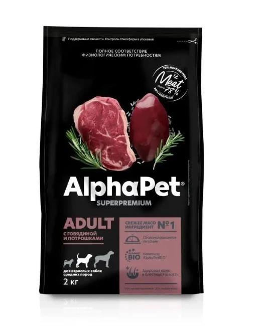 Корм AlphaPet Superpremium на основе говядины и потрошков, разработан для взрослых собак средних пород компанией Alphapet. Применяется швейцарская технология производства, позволяющей включать свежее мясо в рацион и гарантирующая высокое качество. Корм для собак сухой содержит 78% натурального мясного белка.