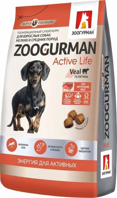 Полнорационный сухой корм для взрослых собак мелких и средних пород Zoogurman Active Life, Телятина/Veal