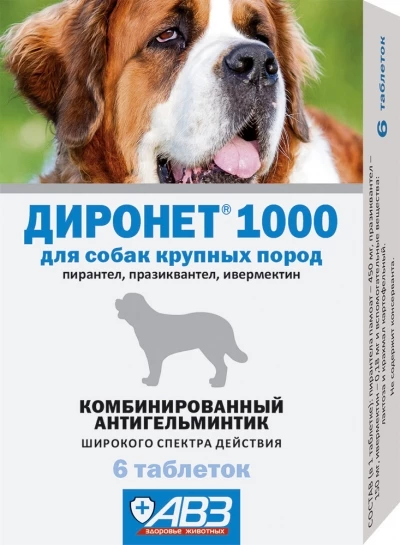 При цестодозах и нематодозах желудочно-кишечного тракта Диронет® 1000 с лечебной и профилактической целью применяют индивидуально перорально однократно в утреннее кормление в следующих дозах: пирантела памоат - 15 мг/кг, празиквантел - 5 мг/кг, ивермектин - 0,006 мг/кг, из расчета 1 таблетка Диронет® 1000 на 30 кг массы собак крупных пород.