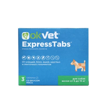 Таблетки для собак от 5кг до 15кг OkVet (Оквет) ЭкспрессТабс от блох, клещей, вшей, круглых и ленточных гельминтов (2 таблетки)