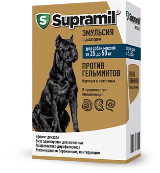 Supramil эмульсия – первая в мире антигельминтная эмульсия широкого спектра действия для собак массой от 25 до 50 кг, предназначенная для лечения и профилактики заражения круглыми и ленточными гельминтами, а также дирофиляриоза.