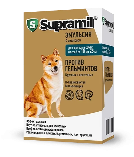 Supramil эмульсия – первая в мире антигельминтная эмульсия широкого спектра действия для собак массой от 10 до 25 кг, предназначенная для лечения и профилактики заражения круглыми и ленточными гельминтами, а также дирофиляриоза. Преимущества препарата