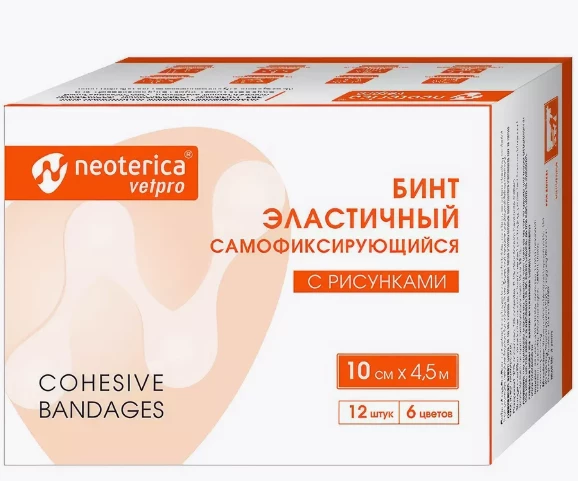 Neoterica Vetpro бинт эластичный самофиксирующийся, с рисунками, 10 см х 4. 5 м Бинт эластичный самофиксирующийся это удобный, современный, бесшовный перевязочный материал высокого качества, обеспечивающий надежную фиксацию на длительный срок. Бинт эластичный Neoterica Vetpro: Легко фиксируется и не прилипает к шерсти; Защищает рану от загрязнения и повторных травм; Гипоаллергенный материал не раздражает кожу; Воздухопроницаем; Влагонепроницаем; Загнутый кончик и легкий отрыв бинта облегчают работу ветеринарного врача. Размер: 10 см х 4,5 м