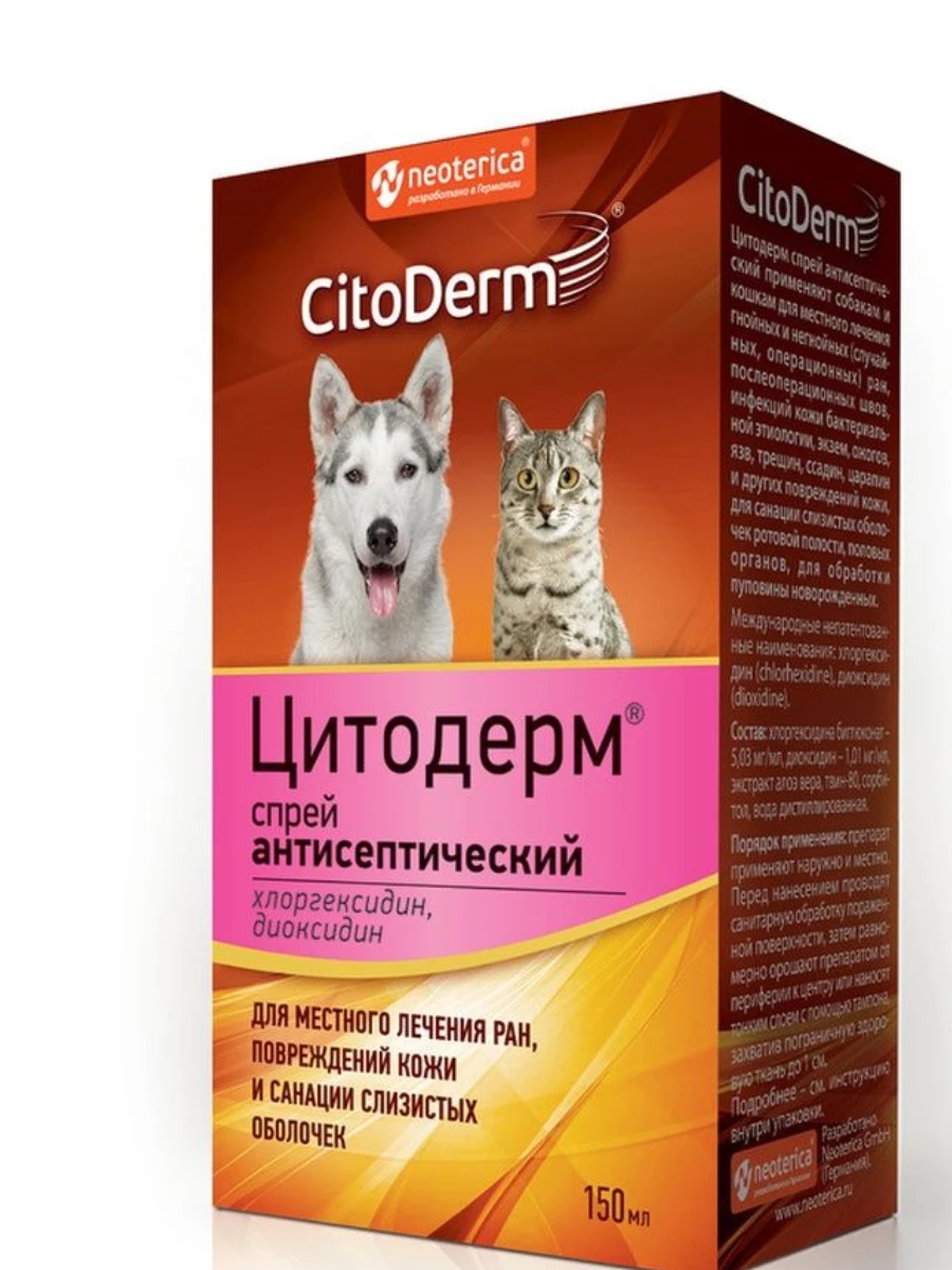 Предназначен для лечения гнойных и негнойных ран, послеоперационных швов, инфекций ран, экзем, ожогов, язв, трещин, для санации слизистых ротовой полости и половых органов, обработки пуповины новорождённых. Citoderm срей антисептический не содержит спирт и подходит для чувствительной кожи, склонной к сухости и раздражению. - Обладает мощным обеззараживающим эффектом. - Обладает ранозаживляющим действием. - Безопасен для кожи и при случайном проглатывании. - Не вызывает жжения и боли. Состав: хлоргексидина биглюконат 5,03 мг/мл, диоксидин 1,01 мг/мл,вспомогательные вещества.