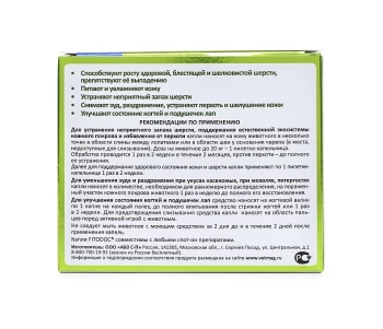 «Капли дерматологические FITODOC®» эффективно устраняют неприятный запах шерсти, сохраняя обоняние животного, уменьшают зуд и раздражение кожи. Зоокосметическое действие обусловлено комплексом сбалансированно подобранных эмолентов, способствующих равномерному распределению активных ингредиентов по поверхности кожного покрова и их лучшему проникновению в глубокие слои эпидермиса, не закупоривая при этом поры и не всасываясь в кровь. После нанесения «Капли дерматологические FITODOC®» восстанавливают структуру и стимулируют обменные процессы в эпидермисе, эффективно