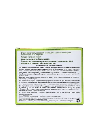 «Капли дерматологические FITODOC®» эффективно устраняют неприятный запах шерсти, сохраняя обоняние животного, уменьшают зуд и раздражение кожи. Зоокосметическое действие обусловлено комплексом сбалансированно подобранных эмолентов, способствующих равномерному распределению активных ингредиентов по поверхности кожного покрова и их лучшему проникновению в глубокие слои эпидермиса, не закупоривая при этом поры и не всасываясь в кровь. После нанесения «Капли дерматологические FITODOC®» восстанавливают структуру и стимулируют обменные процессы в эпидермисе, эффективно