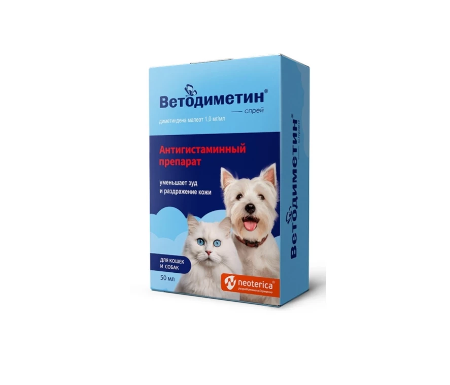 Ветодиметин спрей – антигистаминный препарат для наружного применения на основе диметиндена малеата, который используется для облегчения зуда и раздражения, вызванных аллергическими проявлениями и паразитарными заболеваниями.