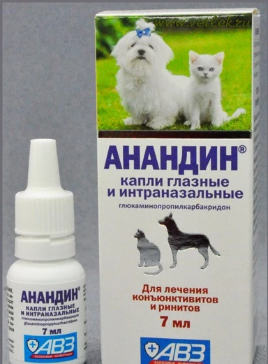 Капли глазные и интраназальные Анандин применяют для лечения конъюнктивитов и ринитов у собак и кошек.