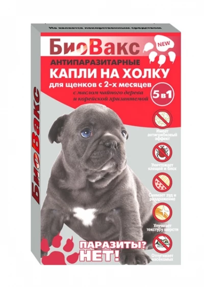 Капли на холку "Биовакс" предназначены для профилактики и избавления от эктопаразитов (клещи, блохи, власоеды) и от энтопаразитов (комары, слепни, мухи).