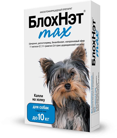 БлохНэт max – инсектоакарицидный препарат для собак с усиленной активной формулой. Предназначен для защиты животных от клещей, блох, вшей, власоедов и комаров.
