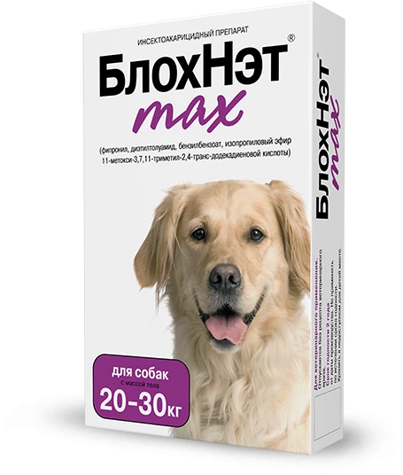 БлохНэт max – инсектоакарицидный препарат для собак с усиленной активной формулой. Предназначен для защиты животных от клещей, блох, вшей, власоедов и комаров.