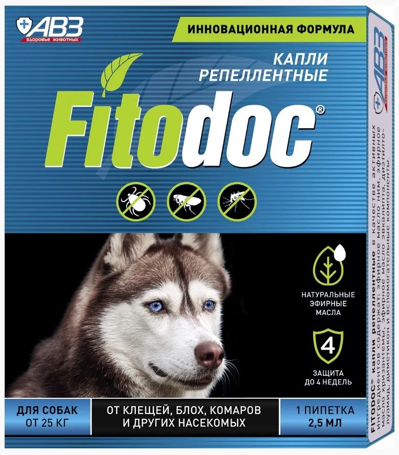 Показания к применению. Капли применяют щенкам с 4-недельного возраста, собакам, в том числе беременным, больным, ослабленным и склонным к аллергии животным, для защиты от нападения блох, вшей, власоедов, комаров, мошек и клещей Дозы и порядок применения. Отломать верх пипетки и, раздвинув шерсть, нанести капли на кожу вдоль позвоночника, в недоступные для слизывания капель места - в области шеи у основания черепа или между лопатками, в дозах, указанных в таблице. Для достижения максимального эффекта, капли наносят в наибольшее количество точек. Масса животного, кг Доза для обработки животного Количество пипеток, штук/объем пипетки, мл для обработки животного До 10 1,0 мл 1/1,0 10-25 1,5 мл 1/1,5 или 2/1,0 Свыше 25 2,5 мл 1/2,5 или 3/1,0 Для обработки животных менее 2 кг, капли наносят в дозе 0,05 мл (две капли) на 0,5 кг массы животного. Повторные обработки на протяжении сезона активности насекомых и клещей рекомендуется проводить по показаниям, но не чаще 1 раза в месяц или после мытья. После мытья животного следует просушить шерсть перед нанесением капель. Капли можно применять одновременно с другими инсектоакарицидными средствами с интервалом 2-3 дня. Для усиления защиты животного от эктопаразитов после применения капель рекомендуется обработать шею, туловище, конечности, живот и хвост животного репеллентным спреем FITODOC® Мах. Противопоказания. Не рекомендуется использовать для животных с повышенной чувствительностью к компонентам капель. Не подлежат обработке кормящие самки и котята моложе 4-недельного возраста. Следует принять меры для предотвращения попадания капель в рот и глаза. Не наносить капли на поврежденную кожу. Не рекомендуется мыть животное за 3 дня до и 3 дня после обработки. Побочные явления. При применении капель побочных явлений и осложнений у животных, как правило, не наблюдается. При повышенной индивидуальной чувствительности капли следует смыть водой с зоошампунем. Противопоказания. Не рекомендуется использовать для животных с повышенной чувствительностью к компонентам капель. Не подлежат обработке кормящие самки и щенки моложе 4-недельного возраста. Следует принять меры для предотвращения попадания капель в рот и глаза. Не наносить капли на поврежденную кожу. Не рекомендуется мыть животное за 3 дня до и 3 дня после обработки. Особые указания. При случайном контакте капель со слизистыми оболочками, их необходимо промыть большим количеством воды. Людям с гиперчувствительностью к компонентам капель следует избегать прямого контакта с данным средством. После использования капель следует тщательно вымыть руки тёплой водой. Состав и свойства. Капли репеллентные FITODOC® в качестве активных ингредиентов содержат: эфирное масло ним, эфирное масло хризантемы, эфирное масло эвкалипта, диэтилтолуамид, диметикон и вспомогательные компоненты. Входящая в состав капель композиция природных эфирных масел обладает широким спектром репеллентного действия в отношении блох, вшей, власоедов, комаров, мошек, клещей и предназначена для защиты собак от их нападения. Действие эфирных масел обусловлено высоким содержанием в них альдегидов и терпенов, которые встраиваются в метаболизм членистоногих и влияют на биохимические процессы, вызывая отпугивающий эффект. Диэтилтолуамид обладает репеллентными свойствами, эффективно защищает животных о