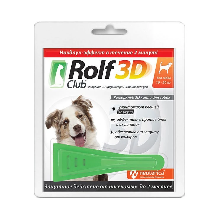 RolfClub 3D имеет три мощных уровня защиты: 1. Нокдаун-эффект парализует клеща ДО укуса – Уже через 2 минуты клещ не может передвигаться и выбирать место для укуса. – Эффект обеспечивает действующее вещество последнего поколения — D-цифенотрин. 2. Уничтожение клещей, блох, вшей, власоедов и др. – Действующее вещество фипронил убивает существующих насекомых и клещей, обеспечивает длительную защиту. 3. Защита от повторного заражения насекомыми – Действующее вещество пирипроксифен прерывает цикл развития блох (и других насекомых), защищает животное от повторного заражения. Капли на холку RolfClub 3D защищают собак: 1 месяц — от иксодовых клещей (переносят пироплазмоз и др. болезни); 2 месяца — от блох, вшей, власоедов; 7 дней — от комаров, москитов, мошек