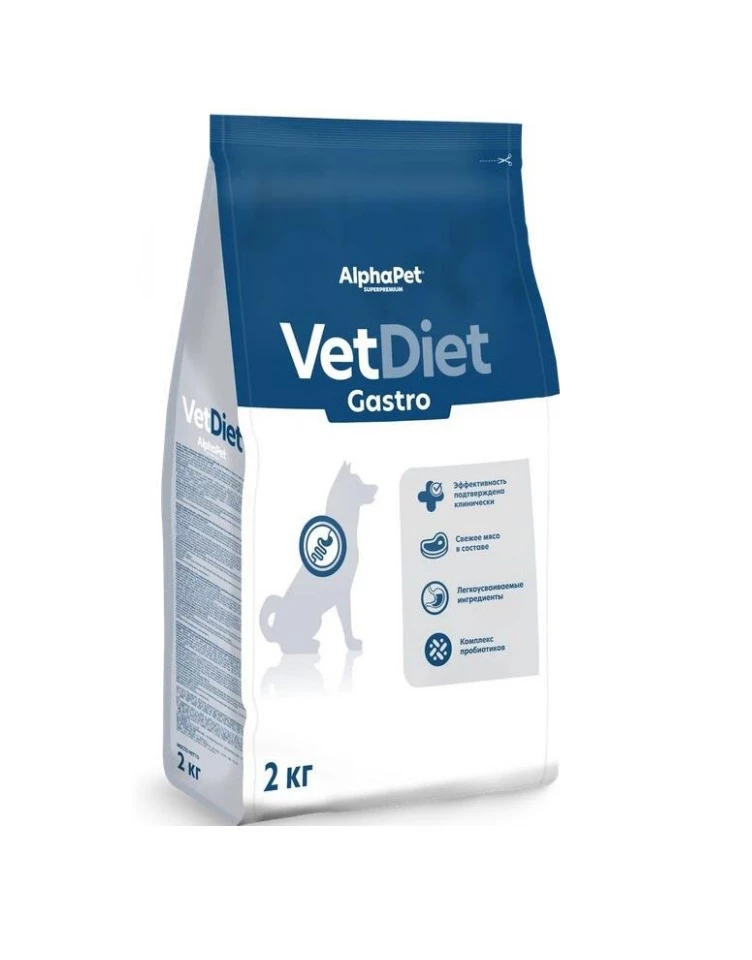 Сухой полнорационный диетический корм AlphaPet VetDiet для взрослых собак рекомендованный при острых расстройствах пищеварения, в реабилитационный период и при истощении.