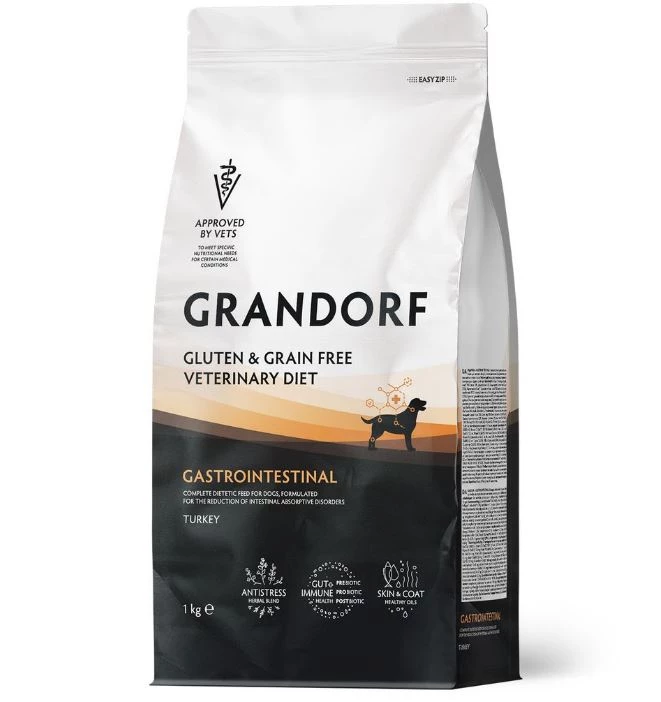 GRANDORF VET - Полнорационный диетический сухой корм для собак, применяемый при острых расстройствах пищеварения и для снижения нарушений всасывания в кишечнике.