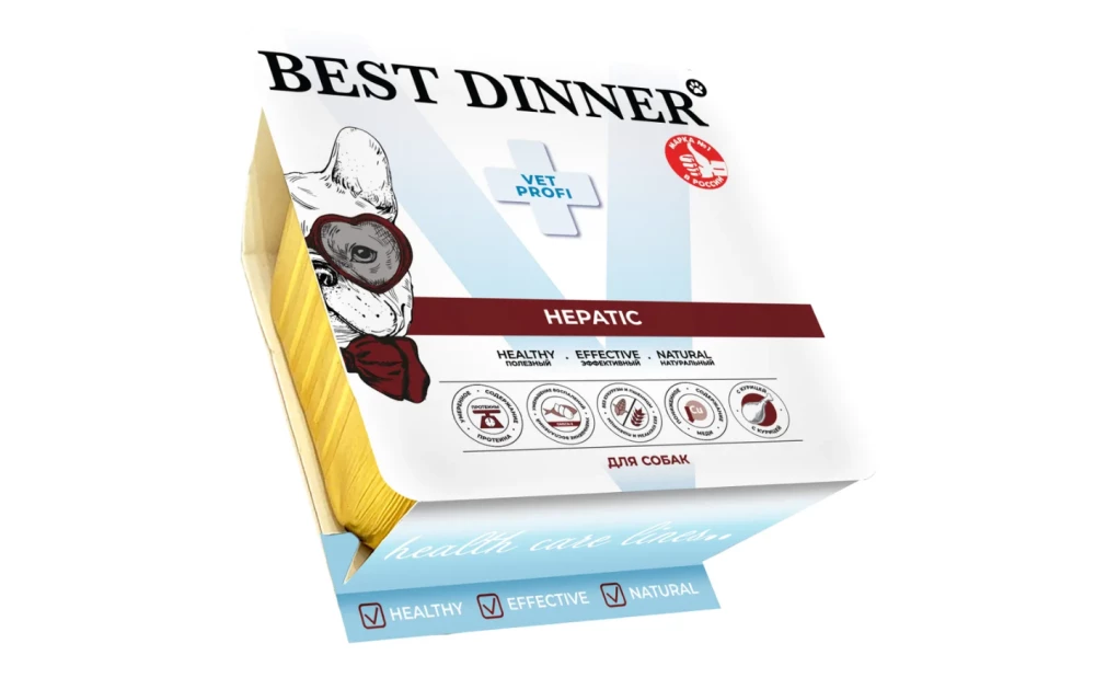 Влажный корм Best Dinner Vet Profi Hepatic для любых собак, нежный паштет с курицей, для поддержания функции печени при хронической печеночной недостаточности Влажный диетический полнорационный консервированный корм для собак для поддержания функции печени при хронической печеночной недостаточности. Применяется при печеночной недостаточности и избыточном накоплении меди в печени. Рекомендуемый период кормления для снижения уровня меди в печени до 6 месяцев, при хронической печеночной недостаточности до 4 месяцев. Рекомендуется проконслуьтироваться с ветеринарным врачом об употреблении или о продлении периода использования данного корма. Состав Мясо и субпродукты (курица), рис, картофельный крахмал, картофельные волокна, витаминно-минеральный комплекс, лососевое масло, льняное масло, L-карнитин, L-триптофан, FOS, MOS Массовая доля влаги – 80 %, Массовая доля белка - 6,5%, Массовая доля жира - 6