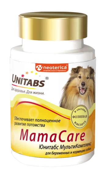 Unitabs МамаCare — это витаминно-минеральный комплекс для беременных и кормящих собак, который содержит фолиевую кислоту и все необходимые витамины, макро- и микроэлементы для полноценного развития потомства.