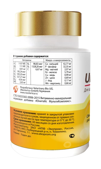 В состав Unitabs МамаCare входит 21 элемент для комплексного действия: фолиевая кислота, витамины А, D3, Е, В1, В2, В6, В12, РР, В5, С, кальций, фосфор, магний, железо, медь, цинк, йод, марганец, омега-6 и омега-3. Оптимальный баланс витаминов, макро- и микроэлементов предотвращает неблагоприятные последствия дефицита веществ в организме беременной и лактирующей собаки, способствует сохранности и полноценному развитию потомства.