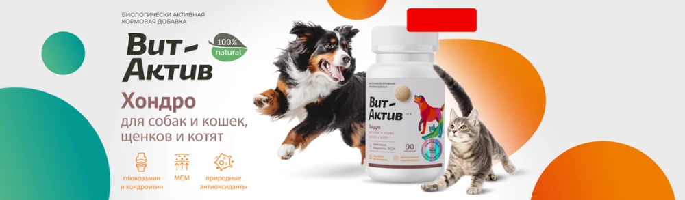 Вит-Актив Хондро - хондропротектор нового поколения с природными антиоксидантами и витаминами. Предназначен для нормализации и поддержания функций опорно-двигательного аппарата собак и кошек в период активного роста и развития, при нарушениях в работе опорно-двигательного аппарата (в т.ч. при дегенеративных нарушениях), в период восстановления после травм, при повышенных нагрузках на суставы (тренировки, избыточный вес) Замедляет разрушение хрящевой ткани, сухожилий и связок, повышает их прочность и эластичность, восстанавливая амортизационную функцию суставов Способствует уменьшению отечности и болезненности, восстанавливая естественную подвижность суставов Способствует нормализации обмена веществ, ускоряя процессы восстановления в суставах Применение и дозировка: Применяют один раз в сутки не менее 30 дней с кормом или независимо от приема основного корма в дозе: - для котят – 1/2 таблетки - кошек менее 3 кг - 1/2 таблетки - для кошек и котят более 3 кг – 1 таблетка - для собак и щенков 1 таблетка на каждые 10 кг массы тела Форма выпуска: 90 таблеток по 0,7 г.
