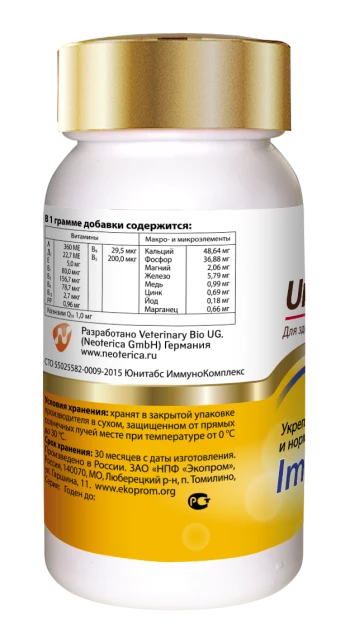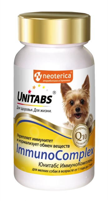 Unitabs ImmunoComplex — это витаминно-минеральный комплекс для взрослых собак, который содержит коэнзим Q10 и все необходимые витамины, макро- и микроэлементы для нормализации обмена веществ и укрепления иммунитета.