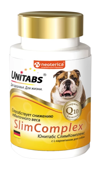 Unitabs SlimComplex — это витаминно-минеральный комплекс для собак, который содержит коэнзим Q10 и все необходимые витамины, макро- и микроэлементы для нормализации обмена веществ и снижения избыточной массы тела.