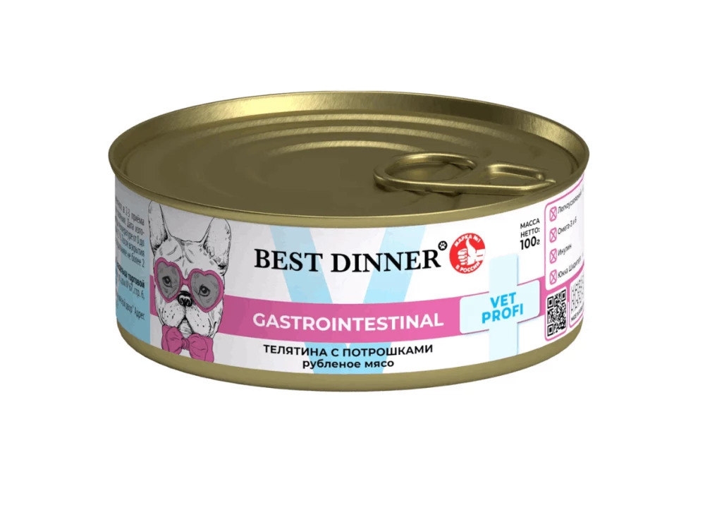 Рубленое мясо для собак с чувствительным пищеварением. Среди всех видов мяса, ценных для собаки, телятина занимает первое место: она богата протеинами, многочисленными витаминами и аминокислотами, в ней практически нет жира. Именно поэтому ее рекомендуют для кормления щенков и беременных, кормящих животных. Потрошки - ценный источник животного белка и важнейших микроэлементов. Инулин – природный пребиотик, стимулирующий выработку полезных микроорганизмов. Юкка Шидигера выводит токсины из организма. Дрожжи полезны для кожи и шерсти, работы желудка и кишечника, укрепляют иммунитет. Рыбий жир является источником энергии и Омега-3 жирных кислот. Позаботьтесь о здоровье любимца вместе с Best Dinner!