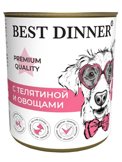 Сбалансированный корм премиум-класса Best Dinner с телятиной и овощами полностью удовлетворяет потребность собаки в белках, макро- и микроэлементах Телятина – нежирное мясо, оно полностью усваивается и не вызывает аллергии, обеспечивает собаке необходимую энергию на весь день. Морковь и лук, как источник клетчатки в готовом рационе, нормализуют пищеварение, стимулируя перистальтику кишечника, насыщают организм животного микроэлементами. Рыбий жир является источником энергии и Омега-3 жирных кислот. Оптимальное содержание влаги облегчает щенкам поедание корма, помогает организму лучше усваивать витамины и минералы. Приятный мясной запах консервированного корма привлекает собак и вызывает у них аппетит.