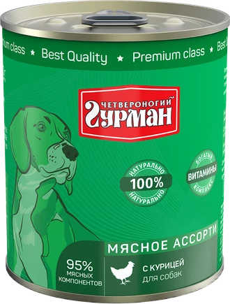 Четвероногий гурман “Мясное ассорти” для собак – это влажный корм премиум класса с фаршевой консистенцией. В его составе 95% мясных компонентов исключительно высшего качества. Рецептуры корма богаты ингредиентами – мясо и всевозможные субпродукты обеспечивают лакомый вкус, притягательный аромат, высокую питательность, а также насыщенный комплекс витаминов и минералов. Корм полностью натуральный – в его составе нет искусственных красителей, ароматизаторов, усилителей вкуса и ГМО.