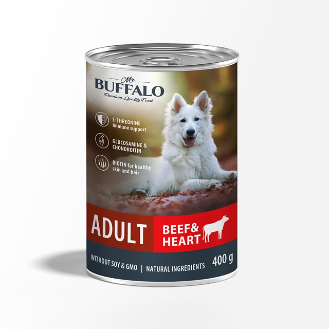 Полнорационный влажный корм Mr. Buffalo мясное ассорти для взрослых собак всех пород включает в себя необходимые питательные вещества и элементы. В процессе производства наших консервированных кормов используются максимально бережные технологии обработки ингредиентов, благодаря им мясо сохраняет большую часть полезных веществ.