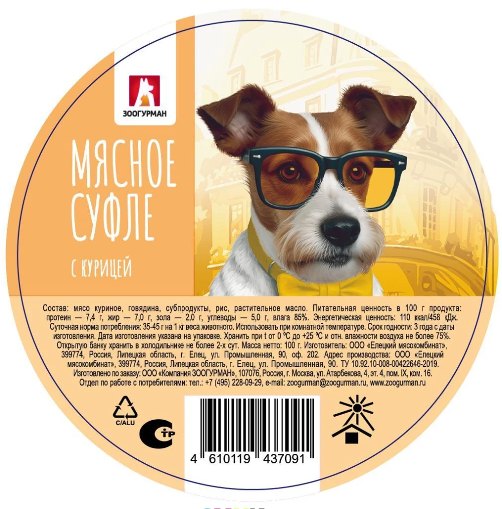 Нежное мясное суфле ЗООГУРМАН создано специально для собак мелких пород. Состав серии оптимально сбалансирован по всем питательным и биологически активным веществам, что обеспечивает необходимый запас микроэлементов и дарит энергию для полноценной активной жизни. Консервированный корм для собак премиум класса. Состав серии оптимально сбалансирован по всем питательным и биологически активным веществам, что обеспечивает необходимый запас микроэлементов и дарит энергию для полноценной активной жизни. Изысканный вкус суфле придется по душе даже самому привередливому питомцу! Рекомендации по кормлению указаны в таблице. Подавайте корм комнатной температуры. Следите за наличием у животного свежей питьевой воды. Состав Ингредиенты: мясо куриное, говядина, субпродукты, рис, растительное масло Питательная ценность в 100г продукта: протеин - 7,4г, жир – 7,0г, зола – 2,0г, углеводы – 5,0г, влага – 85% Энергетическая ценность: 110 ккал/458кДж